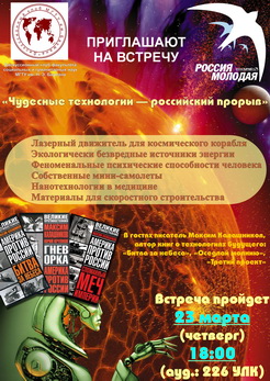 11 ноября 2010г. прошла встреча, посвященная новым технологиям искусственного интеллекта. С докладом выступил доктор технических наук, член-корреспондент Академии Криптографии РФ, автор бестселлеров по информационной войне Сергей Павлович Расторгуев. Наряду с вопросами о перспективах развития информационных технологий в современной России, им были рассмотрены вопросы о границах самообучения и самоорганизации «одухотворенных» аватаров.